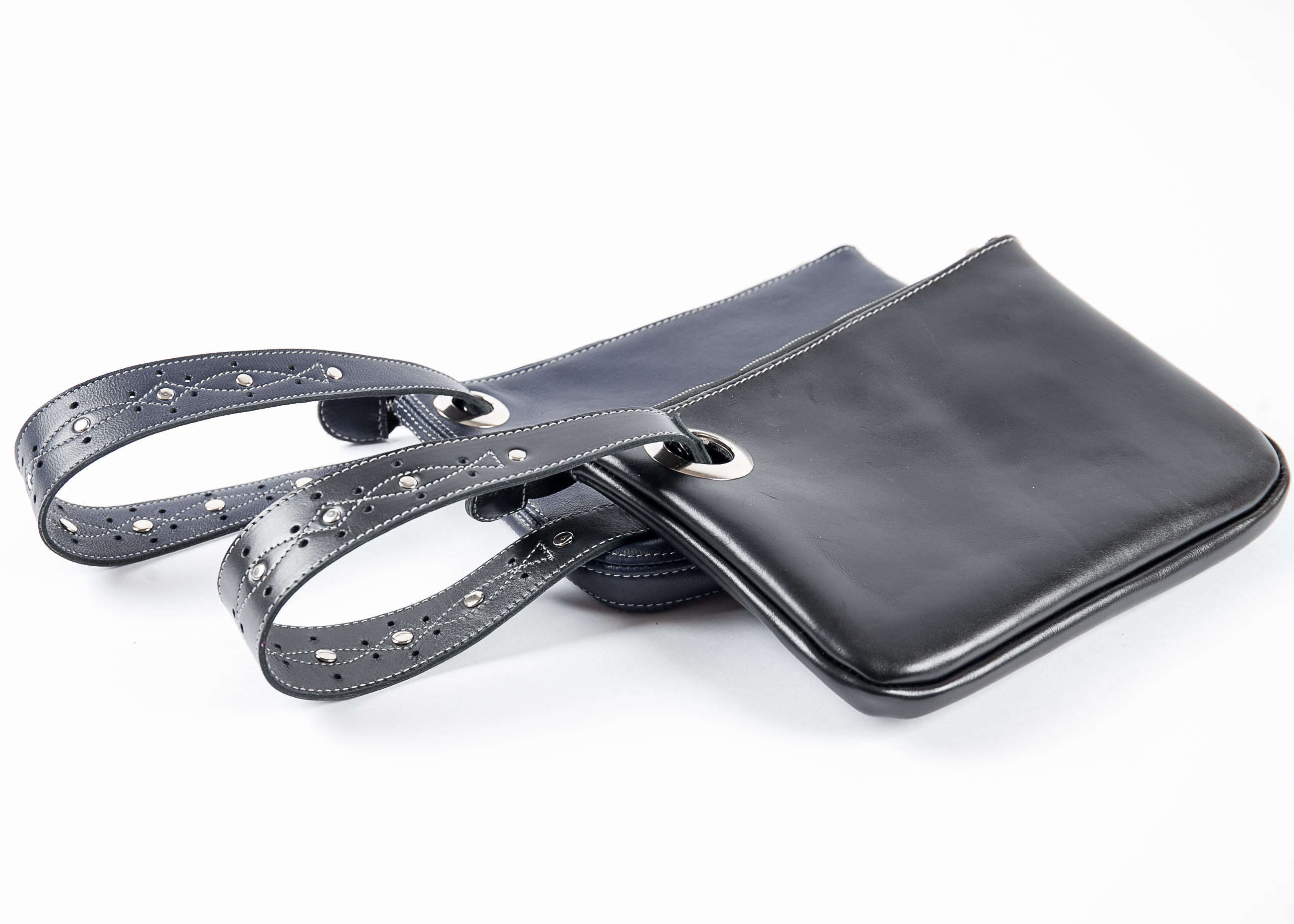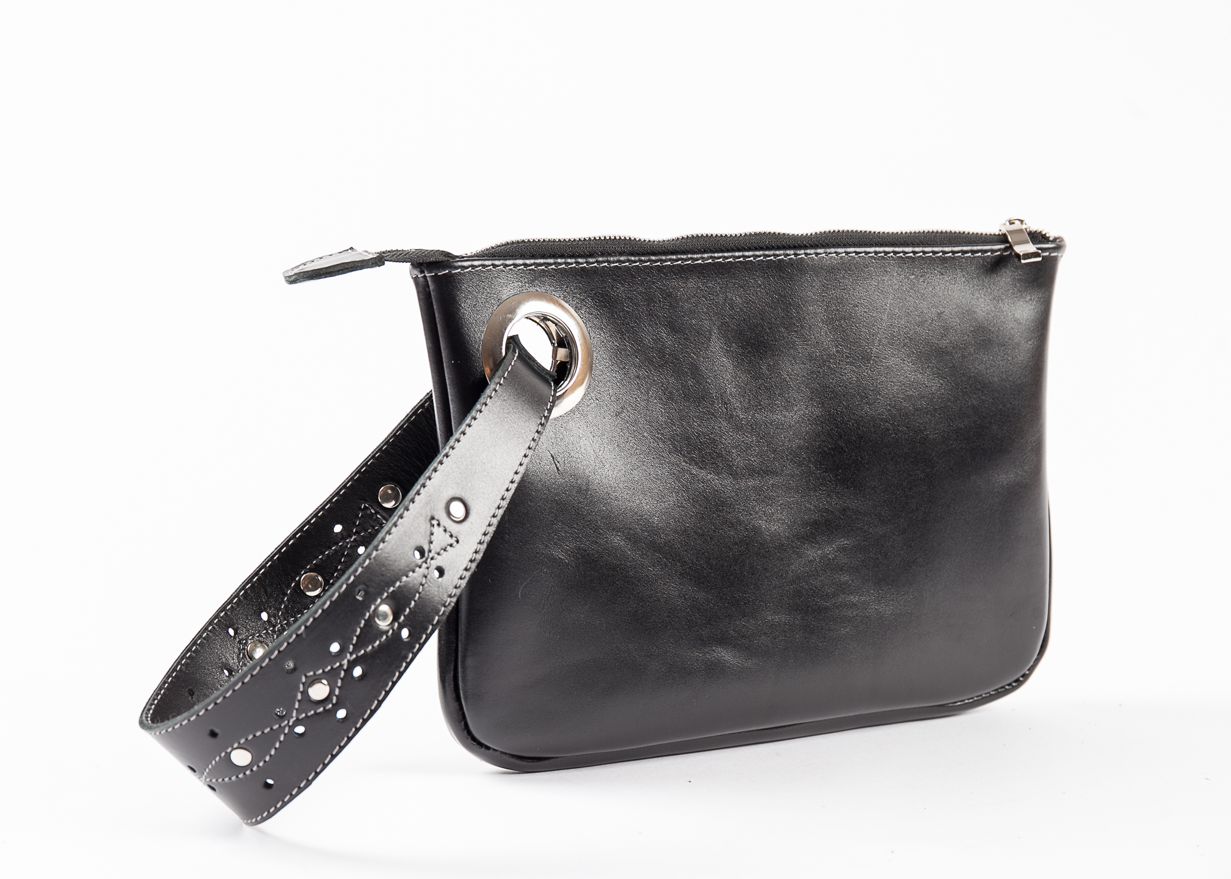 The bag has a simple elegant form and a beautiful wrist strap. The bag is decorated with rivets and holes. The bag has one compartment with a zipper closure. It is stylish, convenient and functional!
