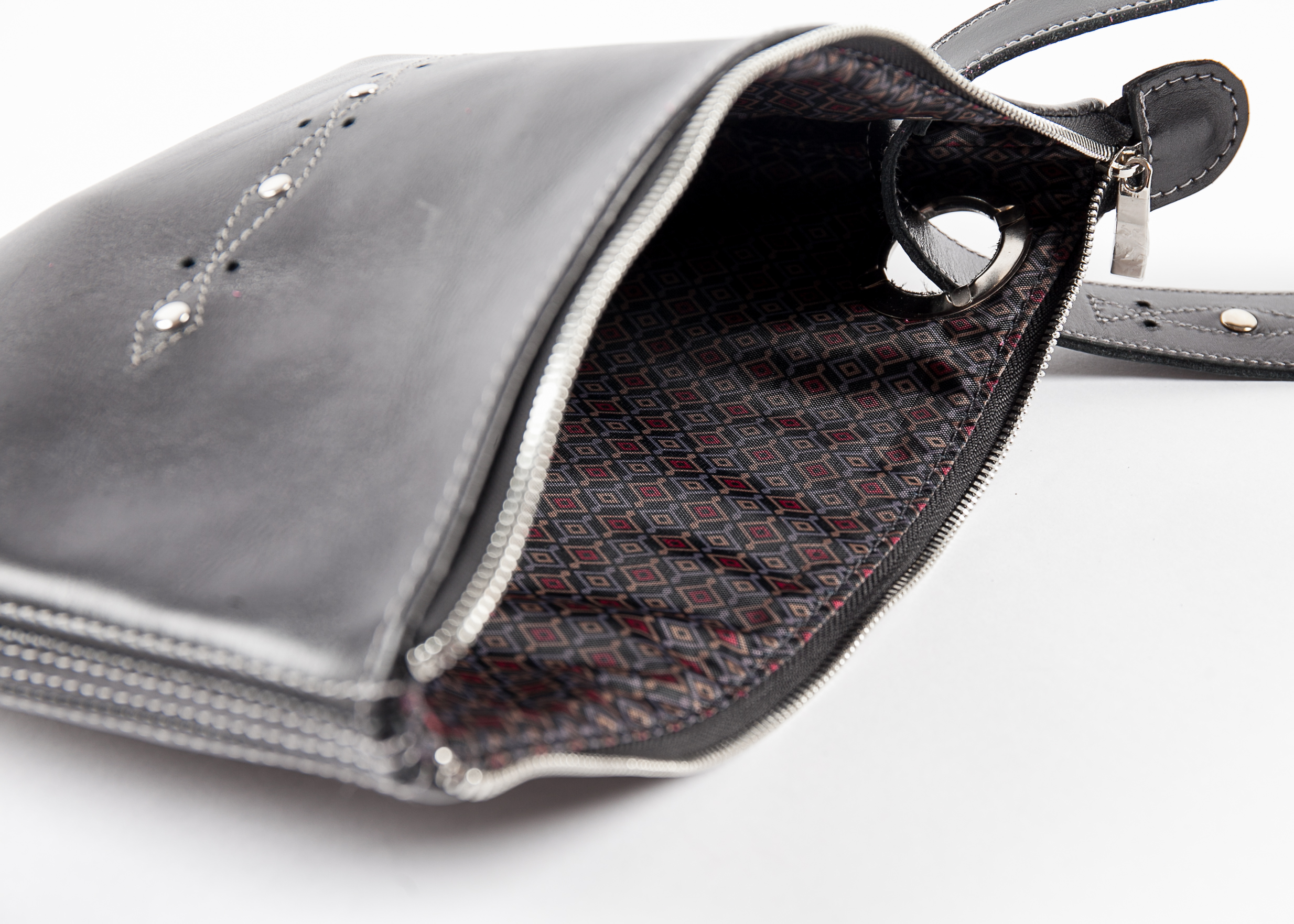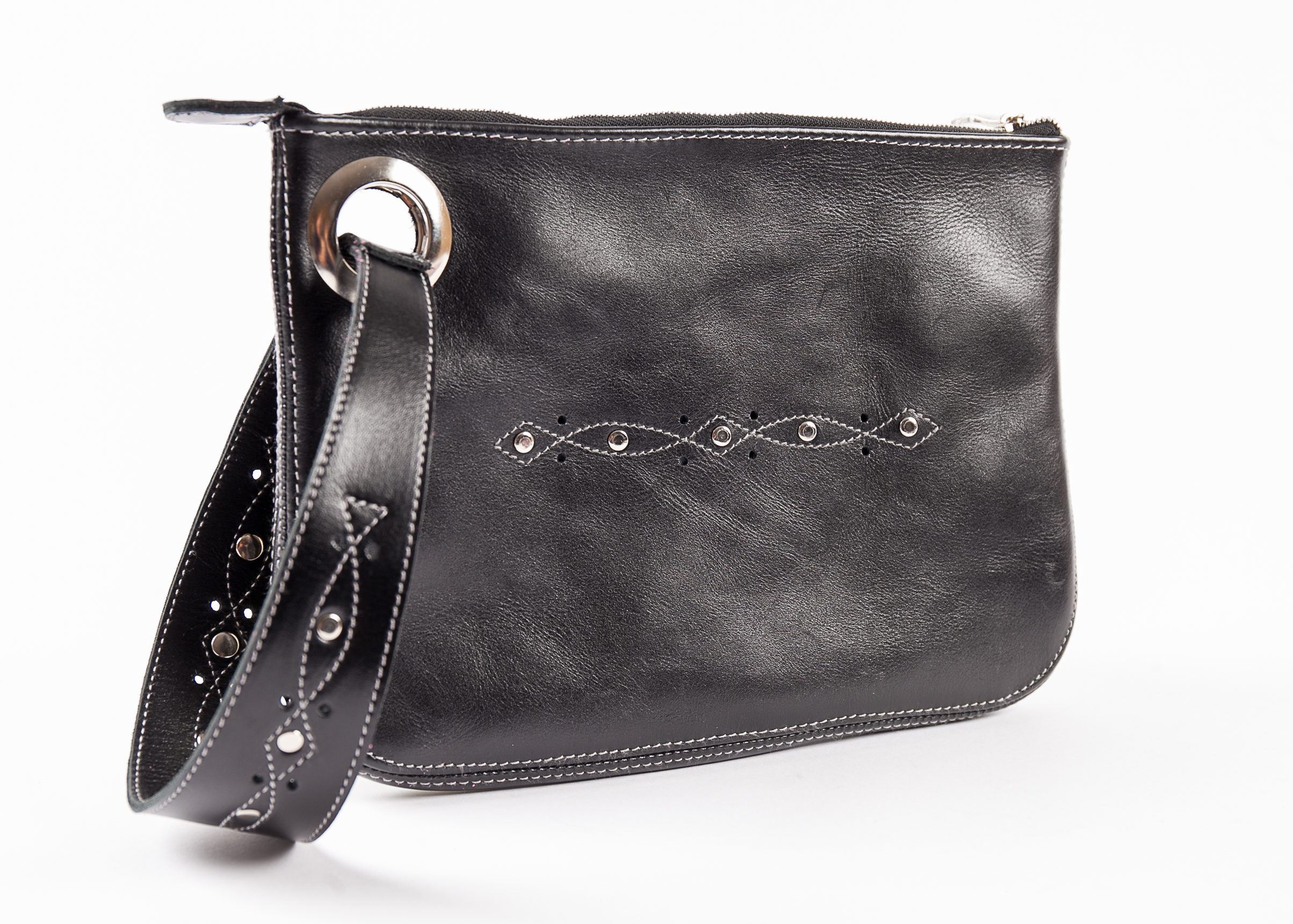The bag has a simple elegant form and a beautiful wrist strap. The bag is decorated with rivets and holes. The bag has one compartment with a zipper closure. It is stylish, convenient and functional!